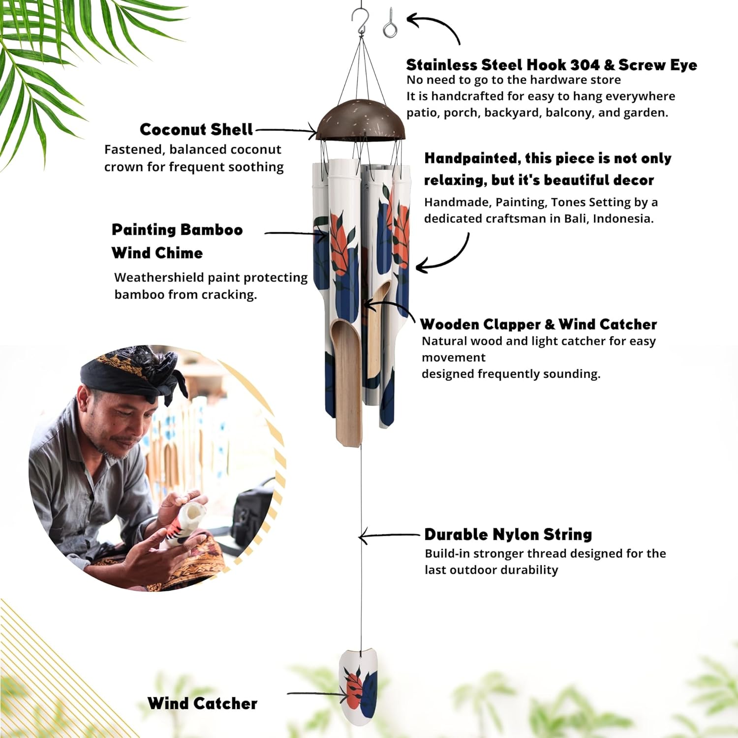 ✨ Measures 45" overall length. Includes S hook & screw eye for easy installation to hang everywhere. Durability outdoor condition, Balanced coconut crown for frequent soothing.